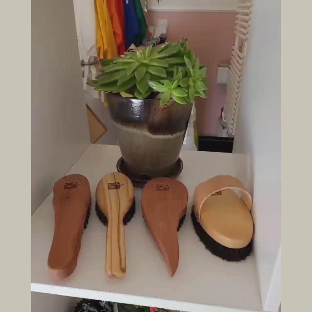 Beachte bitte, das eine Naturhaarbürste nie so "hart" sein kann wie eine klassische Kunststoffbürste, die bis zur Kopfhaut vordringt!