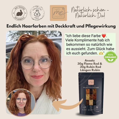 Warm flame red is a pure warm red tone with a dark component, meaning it only dyes your hair slightly darker, the depth of your natural tone remains and shimmers intensely red. It also covers gray hair very well, remains a little lighter on your gray hair parts, and this mottled look creates the impression of gentle strands. Be careful, this color will be particularly bright red in your gray areas.