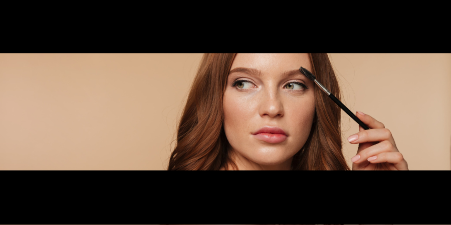 Frau mit langen braunen Haaren, die sich mit einer Bürste vor einem beigen Hintergrund die Augenbrauen putzt.