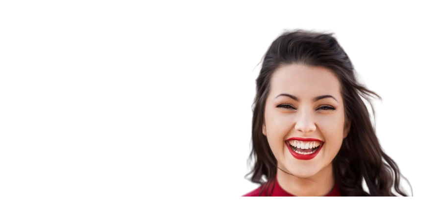 Eine dunkelhaarige Frau vor einem weißen Hintergrund die breit lacht