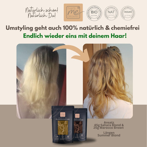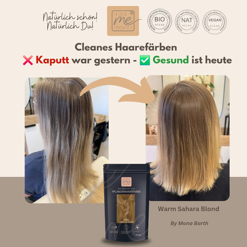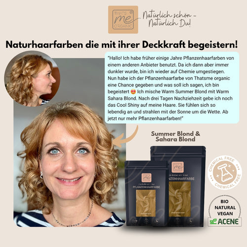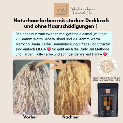 Il caldo biondo Sahara è un tono caldo biondo dorato-sabbia della serie di tinte vegetali per capelli Thats me Organic®. Copre molto bene i capelli grigi, con un leggero riflesso dorato. Questa miscela di colori non contiene rosso, ha un colore più sabbioso, ma non è freddo o cinereo. Non vi è alcun rischio di una dominante verde opaca. Più a lungo lascerai agire questo colore, più il colore risulterà ricco e opaco, anche un po' più dorato.