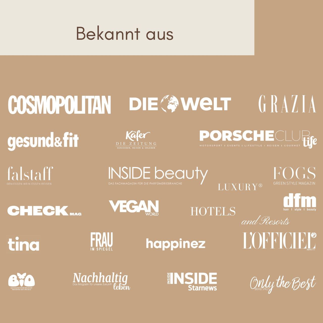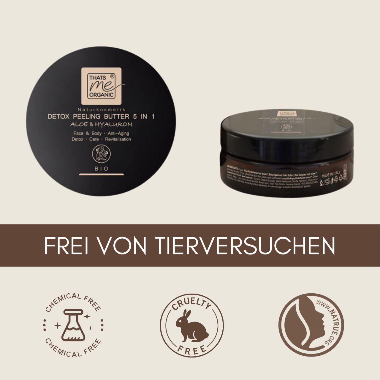 Jedes Produkt ist frei von Titandioxid, Silikonen, künstlichen Duftstoffen (Parfüm), chemischen Zusätzen, Farbverstärkern, Peroxiden, Paraffinen, PEGs, synthetischen Konservierungsstoffen, Parabenen und selbstverständlich ohne Tierversuche.