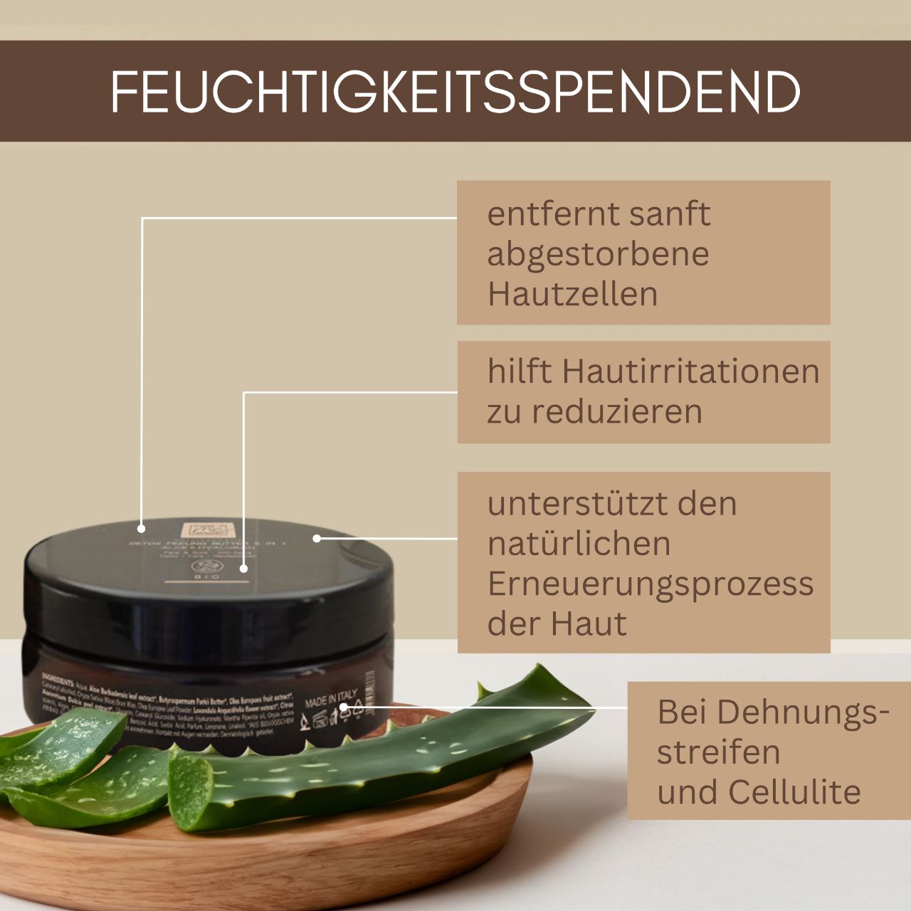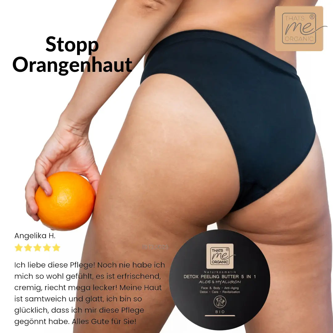 Unsere BIO-DETOX PEELING BUTTER Aloe 5 in 1 ist eine multifunktionale Pflegecreme mit Peeling-Effekt. Lavendel- und Orangenextrakte in Kombination mit Aloe-Gel und Reispulver tragen zur Pflege der Haut bei. Durch die besondere Zusammensetzung mit Reispulver und mikronisierten Olivenblättern wird ein sanftes Peeling ermöglicht.