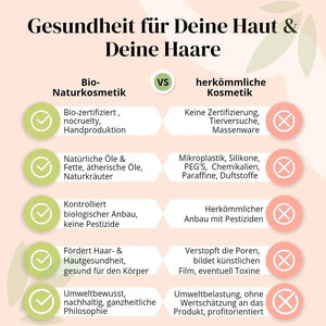 Jedes Produkt ist frei von Titandioxid, Silikonen, künstlichen Duftstoffen (Parfüm), chemischen Zusätzen, Farbverstärkern, Peroxiden, Paraffinen, PEGs, synthetischen Konservierungsstoffen, Parabenen und selbstverständlich ohne Tierversuche.