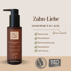 Wir lieben unsere BIO-Zahncreme ZAHN-LIEBE 5 in 1 so sehr. Wir haben alles was es auf dem Markt an fluoridfreien Zahncremes + Gels gibt ausprobiert, nichts hat uns zufrieden gestellt. Das war der Ansporn etwas ganz eigenes, noch nie dagewesenes, zu entwickeln. Herausgekommen ist eine außergewöhnliche Kombination auf Basis von Aloe Vera für eine umfassende Mundpflege. Unsere neue Zahn-Liebe ist einfach perfekt, nicht zu minzig, lang anhaltende Wirkung, reminieralisierende Eigenschaften, desinfizierend, 24h+ Schutz und Mundwasser, alles in einem Produkt. Deshalb auch der wie wir finden passende Name ZAHN-LIEBE ♥ Die perfekte Mundhygiene. Ideal bei Zahnfleischproblemen!
