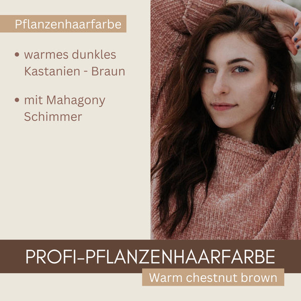 Warm chestnut brown ist ein warmer Rotbraun-Ton, mit dunklen Anteilen, d.h. er färbt Deine Haare dunkler und leicht rötlich, ähnlich einem Kastanienrot. Er deckt auch graues Haar sehr gut ab, bleibt auf Deinen grauen Haaranteilen etwas heller, durch diese melierte Optik entsteht der Eindruck sanfter Strähnen.