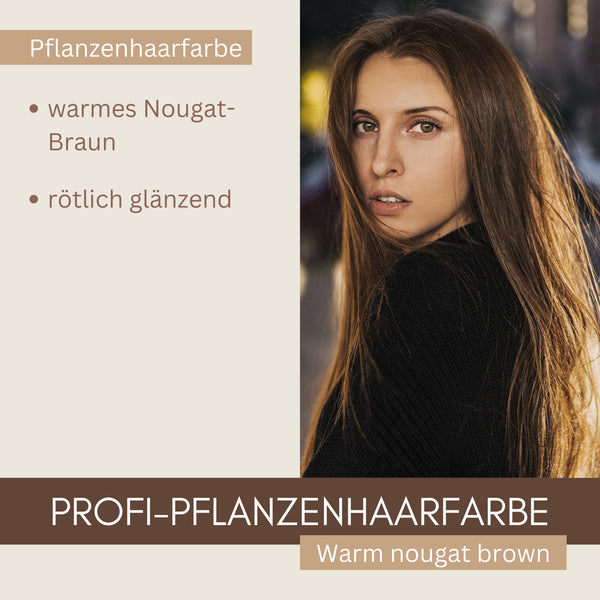 Warm nougat brown ist ein warmer goldschimmernder Braunton. Der dunkle Anteil in dieser Farbmischung färbt Dein Haar in einer mitteldunklen Farbtiefe. Möchtest Du eine stärkere Abdunklung Deiner Haare, dann wähle "warm chocolate brown" oder Mische beide Farben. Feel free. Der Farbton deckt auch graues Haar sehr gut ab, bleibt auf Deinen grauen Haaranteilen etwas heller, durch diese melierte Optik entsteht der Eindruck sanfter Strähnen.