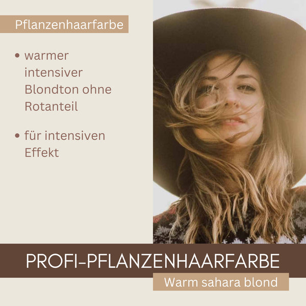Warm Sahara blond ist ein warmer beige-sandfarbener Blondton der Thats me Organic® Pflanzenhaarfarben-Serie, er deckt sehr gut Deine grauen Haare ab, mit einem ganz leichten Gold-Schimmer. Diese Farbmischung enthält keinen Rotanteil, er wird eher sandfarben, ist aber nicht kühl oder aschig im Stich. Es besteht keine Gefahr eines Matt-Grünstichs. Je länger Du diesen Farbton einwirken lässt, desto satter und besser deckend wird er im Farbergebnis, auch etwas goldener.