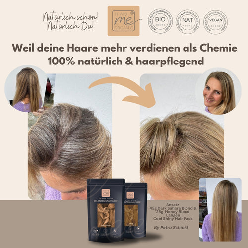 Ideal, um Deinen ursprünglichen Blondton wieder aufzufrischen oder um den Farbunterschied zwischen Deinem Ansatz und Deinen Haarlängen bzw. Haarspitzen optisch auszugleichen. Aber denken Sie daran, dass unsere Pflanzenhaarfarbe Ihren dunklen Ansatz oder Ihren Farbton nicht aufhellen kann. Der Farbton deckt auch graues Haar gut ab, bleibt auf Deinen grauen Haaranteilen etwas heller, durch diese melierte Optik entsteht der Eindruck sanfter Strähnen.