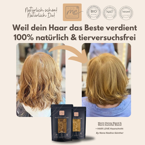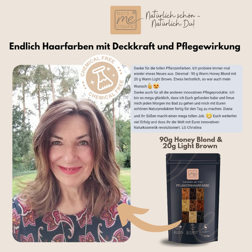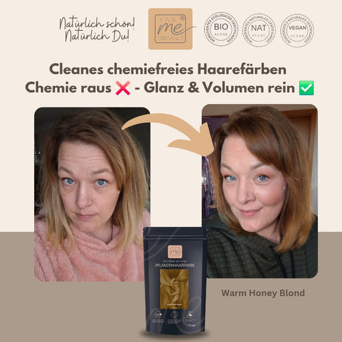 Warm honey blond ist ein wärmerer honig-bernsteinfarbener Blondton der Thats me Organic® Pflanzenhaarfarben-Serie, er deckt sehr gut Deine grauen Haare ab, mit einem ganz dunkleren Gold-Schimmer. Diese Farbmischung enthält keinen direkten Rotanteil im Rezept, wird aber doch honiggolden warm. Das warme Honigblond ist dunkler und intensiver als das warme Saharablond und heller als das warme Hellbraun. Es besteht keine Gefahr eines Matt-Grünstichs. Je länger Du diesen Farbton einwirken lässt, desto satter und besser deckend wird er im Farbergebnis, auch etwas goldener und dunkler.