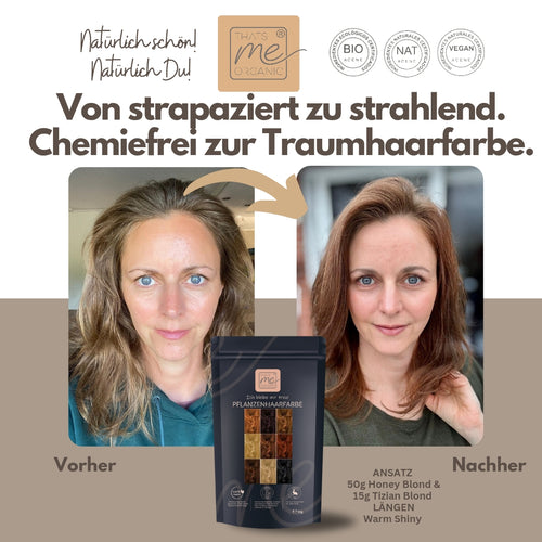 Warmes Honigblond ist ein wärmerer honig-bernsteinfarbener Blondton der Thats me Organic® Pflanzenhaarfarben-Serie, er deckt sehr gut Deine grauen Haare ab, mit einem ganz dunkleren Gold-Schimmer. Diese Farbmischung enthält keinen direkten Rotanteil im Rezept, wird aber doch honig-golden warm. Das warme Honigblond ist dunkler und intensiver als das warme Saharablond und heller als das warme Hellbraun. Es besteht keine Gefahr eines Matt-Grünstichs. Je länger Du diesen Farbton einwirken lässt, desto satter und besser deckend wird er im Farbergebnis, auch etwas goldener und dunkler.