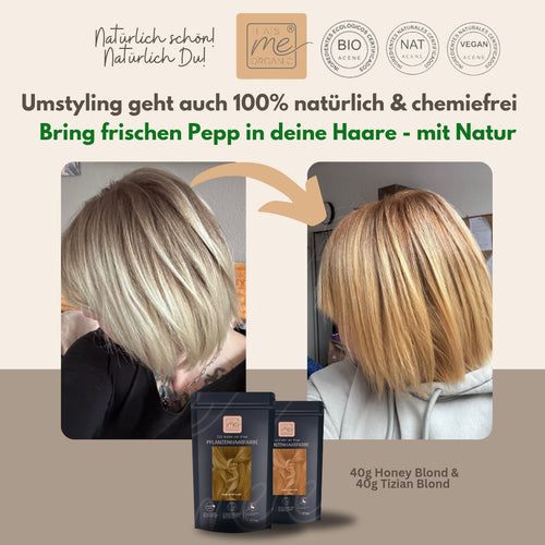 Ideal, um Deinen ausgeblichenen Blondton wieder aufzufrischen oder um den Farbunterschied zwischen Deinem Ansatz und Deinen Haarlängen bzw. Haarspitzen optisch auszugleichen. Aber denken Sie daran, unsere Pflanzenhaarfarbe kann Ihren dunklen Ansatz oder Ihren Farbton nicht aufhellen. Der Farbton deckt auch graues Haar gut ab, bleibt auf Deinen grauen Haaranteilen etwas heller, durch diese melierte Optik entsteht der Eindruck sanfter Strähnen.