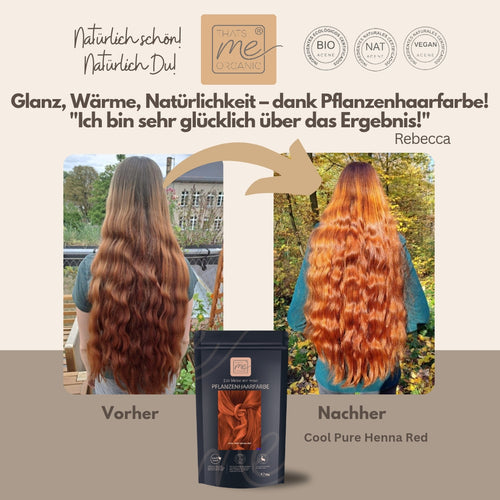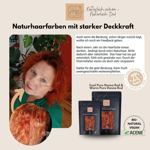 Cool pure Henna ist ein reiner kühler Hennarot-Ton, ohne dunkle Anteile, d.h. er färbt Deine Haare im Ton nicht dunkler, sondern die Tiefe Deines Naturtons bleibt und schimmert intensiv kühl hennarot. Er deckt auch graues Haar sehr gut ab, bleibt auf Deinen grauen Haaranteilen etwas heller, durch diese melierte Optik entsteht der Eindruck sanfter Strähnen. Achtung an Deinen grauen Stellen wird dieser Farbton besonders leuchtend rot.