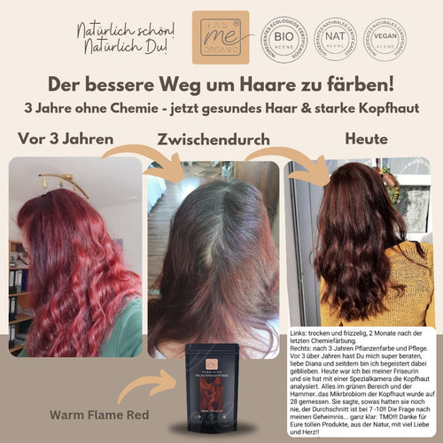 Warm flame red ist ein reiner warmer Rot-Ton, mit einem dunklen Anteil, d.h. er färbt Deine Haare im Ton nur leicht dunkler, die Tiefe Deines Naturtons wird etwas dunkler und schimmert intensiv rot. Er deckt auch graues Haar sehr gut ab, bleibt auf Deinen grauen Haaranteilen etwas heller, durch diese melierte Optik entsteht der Eindruck sanfter Strähnen. Achtung an Deinen grauen Stellen wird dieser Farbton besonders leuchtend rot.