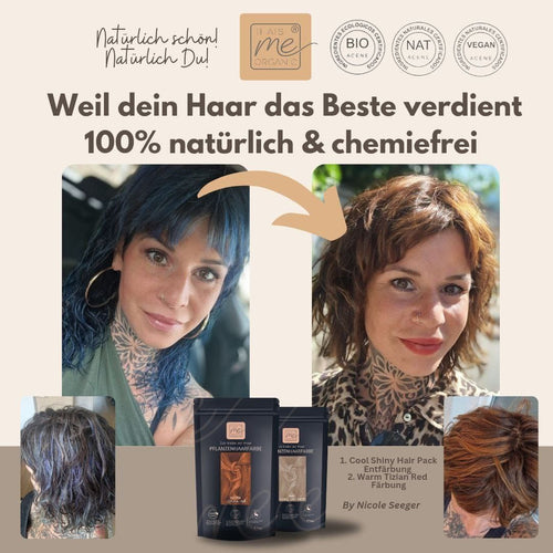 Hinweis: Die dargestellten Farbbeispiele wurden teilweise digital erstellt und dienen zur Orientierung, wie die Farbe auf unterschiedlichen Naturhaartönen wirken kann. Das tatsächliche Farbergebnis kann je nach Ausgangshaarfarbe, Haarstruktur und Einwirkzeit variieren. Eine Pflanzenhaarfarbe wirkt immer individuell und lässt die natürliche Melierung der eigenen Haarfarbe bestehen. Zusätzlich findest du im Shop rund 1.000 echte Vorher-Nachher-Beispiele von Kundinnen, die ihre Haare mit unserer Pflanzenhaarfarbe gefärbt haben.