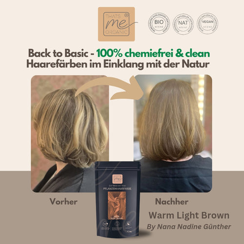 Warm light brown ist ein heller warmer schimmernder Hell-Braunton. Der dunkle Farbanteil in dieser Farbmischung färbt Dein Haar in einer hellbraunen Farbtiefe. Er ist heller als das "warm golden brown" und dunkler als das "summerblond" oder das "sahara blond". Möchtest Du eine stärkere Abdunklung Deiner Haare, dann wähle "warm golden brown" oder "warm Nougat brown" oder mache Dir eine individuelle Mischung aus den Farben. Feel free. Der Farbton deckt auch graues Haar sehr gut ab, bleibt auf Deinen grauen Haaranteilen etwas heller, durch diese melierte Optik entsteht der Eindruck sanfter Strähnen.