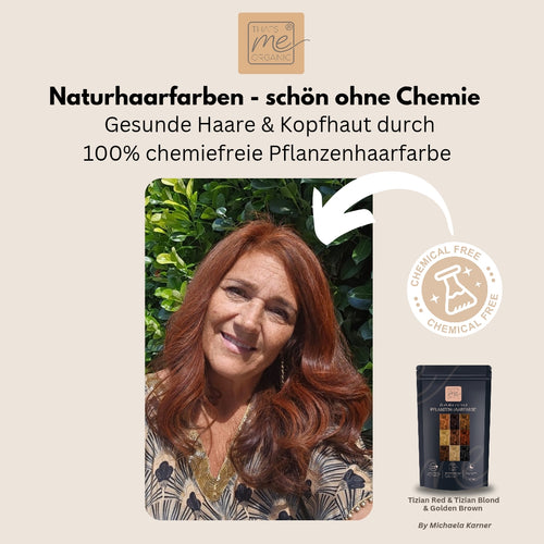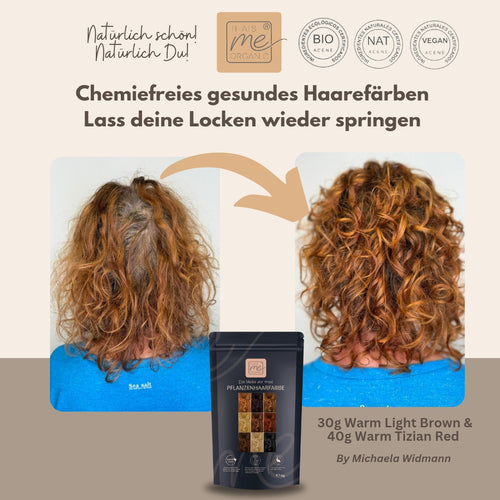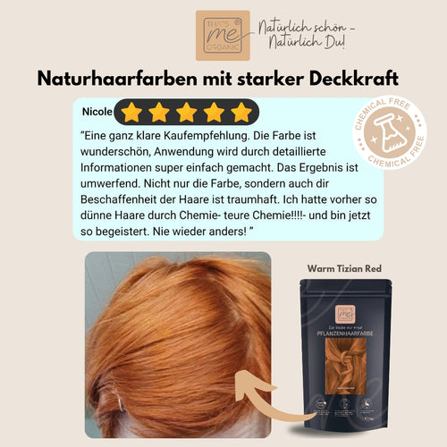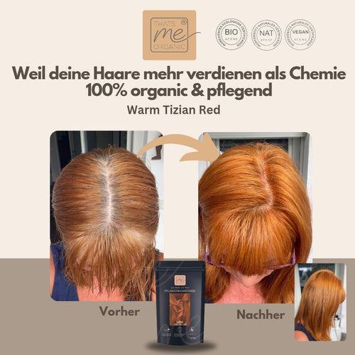Warm tizian red ist ein warmer Kupfer schimmernder Rotton. Dieser Farbton enthält keine dunklen Farbanteile, d.h. er bleibt in der Farbtiefe Deines Naturtons und färbt ihn Kupfer-Rot schimmernd. Möchtest Du ein dunkleres Farbergebnis haben, dann wähle "warm copper brown" oder mische beide Farbtöne zusammen. Wenn Du "warm tizian red" pur verwendest, dann pass an Deinen grauen Stellen auf, sie werden sehr leuchtend Kupfer, da ist ist sinnvoller für Dich einen dunkleren Farbton, wie schon erwähnt, zu wählen. Feel free. Der Farbton deckt auch graues Haar sehr gut ab, bleibt auf Deinen grauen Haaranteilen etwas heller, durch diese melierte Optik entsteht der Eindruck sanfter Strähnen.