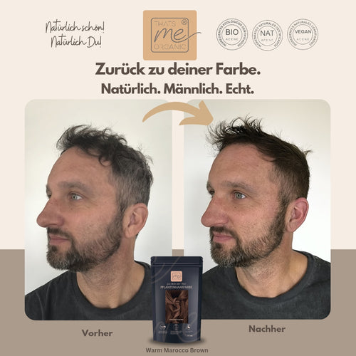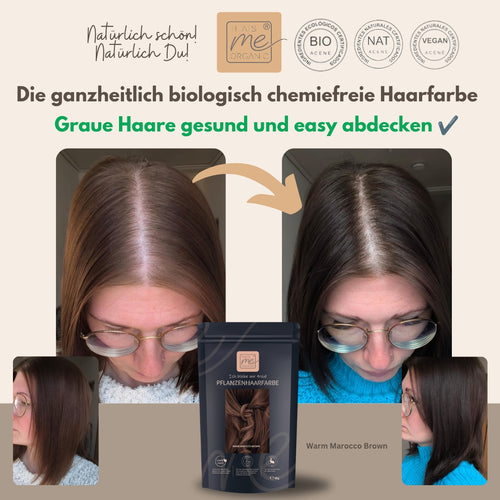 Das 'warm marocco brown' ist gelblich abgemischt - nicht rötlich -, dadurch entsteht eine leichte Wärme im Farbton. Das "warm marocco brown" deckt auch graues Haar sehr gut ab, bleibt auf Deinen grauen Haaranteilen gering heller, durch diese melierte Optik entsteht der Eindruck sanfter Strähnen, wie bei allen Pflanzenhaarfarbentönen. Je länger die Einwirkzeit, desto dunkler, satter, besser deckender und länger haltbarer wird das Farbergebnis. Bitte halte Dich genau an unsere Anleitung.