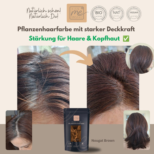 Warm nougat brown ist ein warmer goldschimmernder Braunton. Der dunkle Anteil in dieser Farbmischung färbt Dein Haar in einer mitteldunklen Farbtiefe. Möchtest Du eine stärkere Abdunklung Deiner Haare, dann wähle "warm chocolate brown" oder Mische beide Farben. Feel free. Der Farbton deckt auch graues Haar sehr gut ab, bleibt auf Deinen grauen Haaranteilen etwas heller, durch diese melierte Optik entsteht der Eindruck sanfter Strähnen.