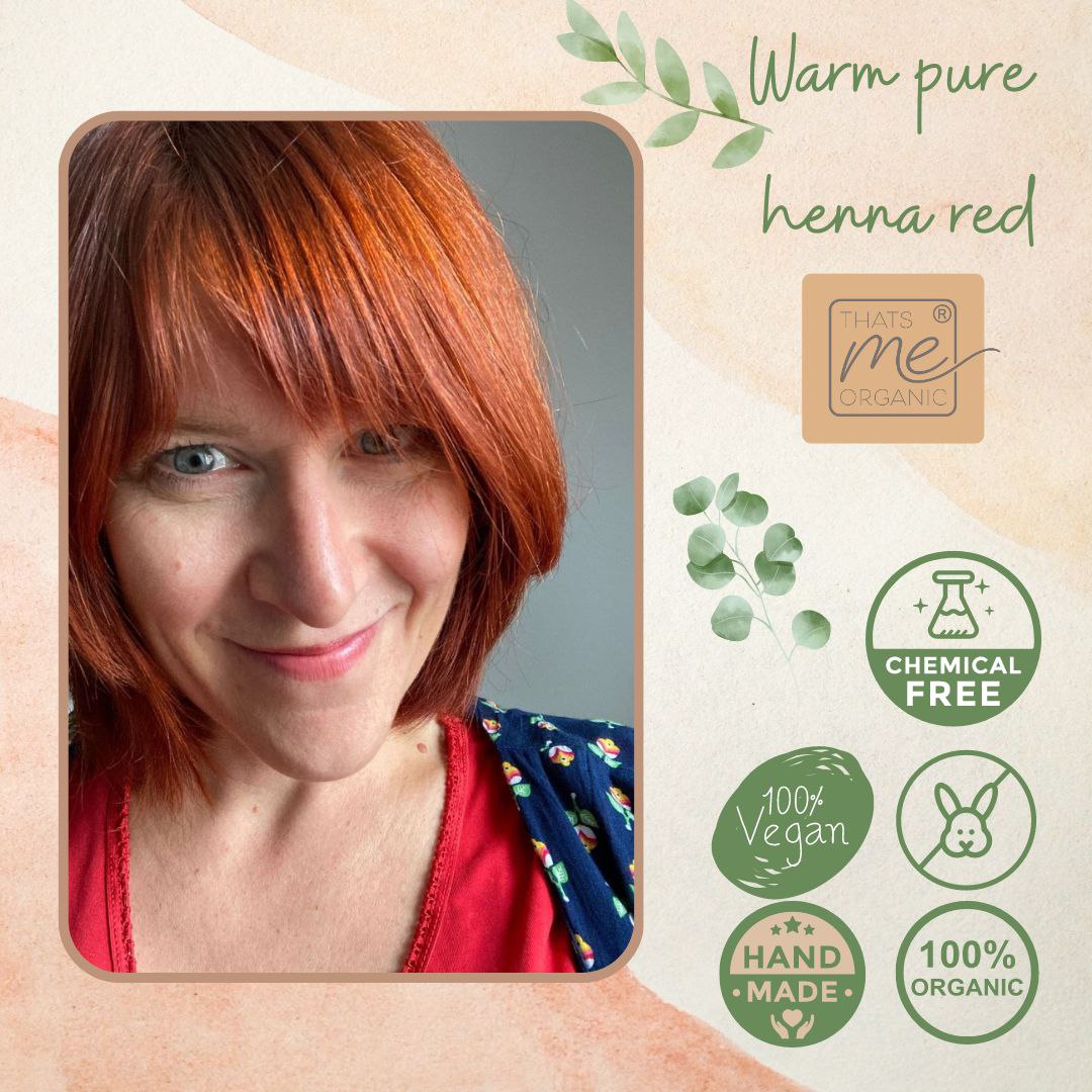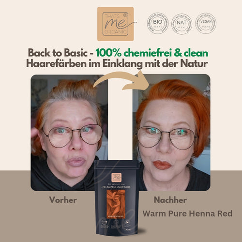 Warm pure Henna ist ein reiner warmer Hennarot-Ton, ohne dunkle Anteile, d.h. er färbt Deine Haare im Ton nicht dunkler, sondern die Tiefe Deines Naturtons bleibt und schimmert intensiv warm henna-rot. Er deckt auch graues Haar sehr gut ab, bleibt auf Deinen grauen Haaranteilen etwas heller, durch diese melierte Optik entsteht der Eindruck sanfter Strähnen. Achtung an Deinen grauen Stellen wird dieser Farbton besonders leuchtend rot.