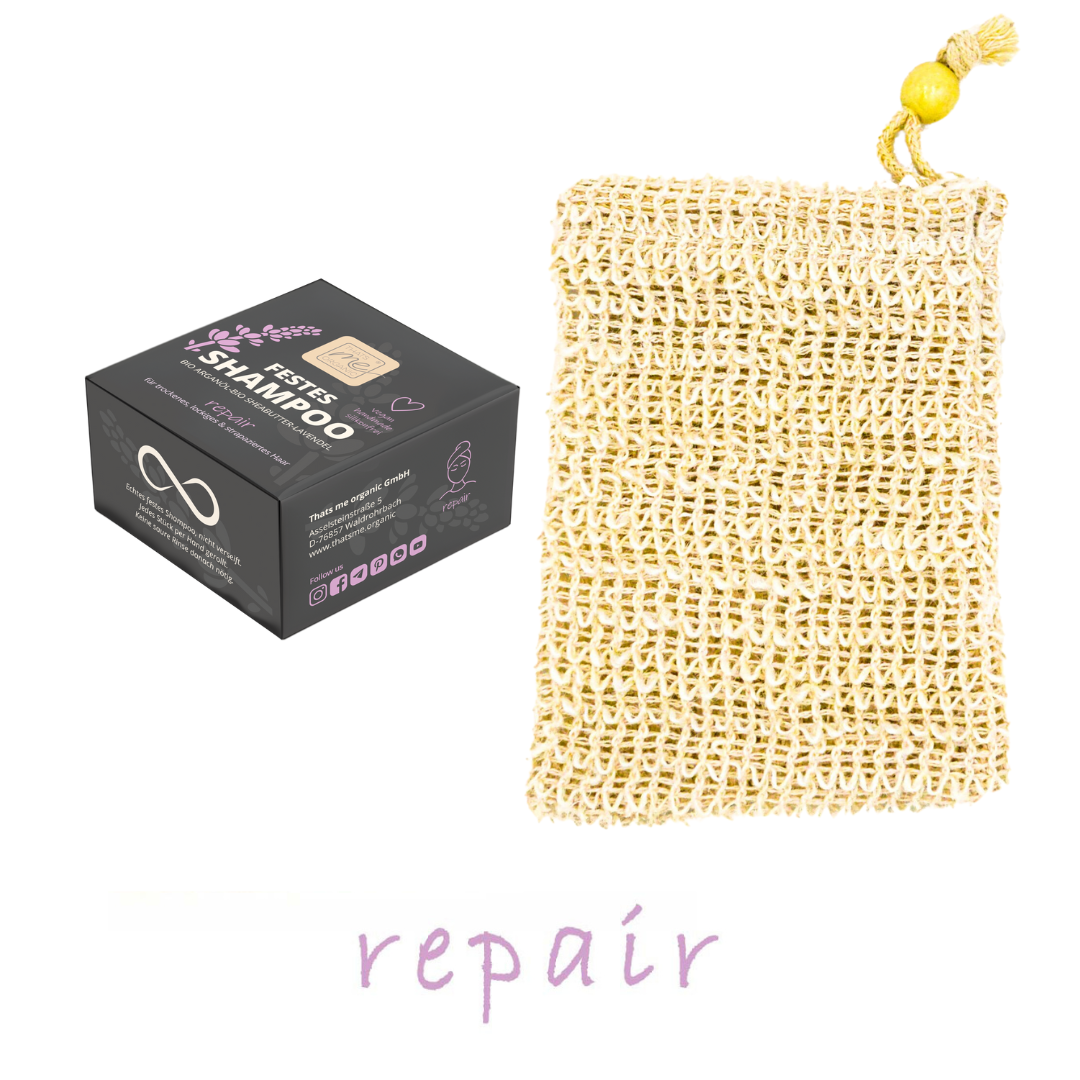 Spar Set Festes Shampoo 'repair' 40g + veganes Seifensäckchen